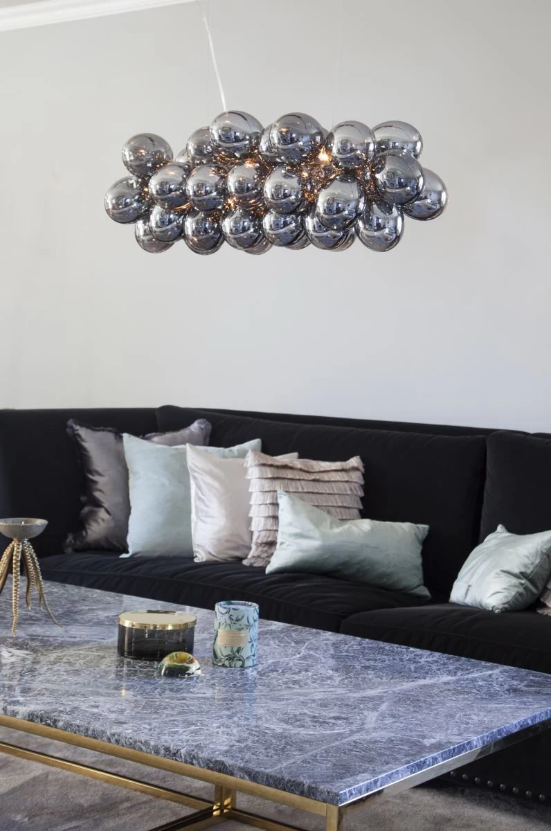 Die schwebende Wolke besteht aus 38 Glastrauben, welche in der Farbgebung Rauchgrau für ein angenehmes Ambiente sorgen. Zum Strahlen benötigt die Gross Bar Hängeleuchte jeweils acht G9-Leuchtmittel mit maximal 40Watt. So haben Sie die Möglichkeit mit den passenden Leuchtmitteln die Lichtverhältnisse in Ihrem Zuhause ganz Ihren Wünschen und Bedürfnissen nach anzupassen. Mit passenden dimmbaren Leuchtmitteln lässt sich die atemberaubende Deckenleuchte zudem über einem externen Dinner dimmen.