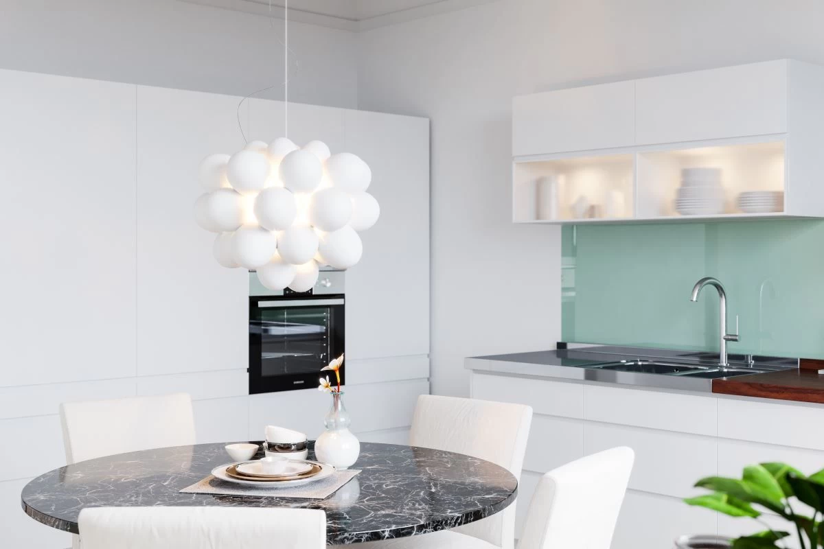 Die schwebende Wolke besteht aus 37 Glasperlen, welche in ihrem matten Weiß einen angenehmen Schimmer abgeben. Zum Strahlen benötigt Gross jeweils acht G9-Leuchtmittel mit maximal 40Watt. So haben Sie die Möglichkeit mit den passenden Leuchtmitteln die Lichtverhältnisse in Ihrem Zuhause ganz Ihren Wünschen und Bedürfnissen nach anzupassen. Mit passenden dimmbaren Leuchtmitteln lässt sich die atemberaubende Deckenleuchte zudem über einem externen Dinner dimmen.