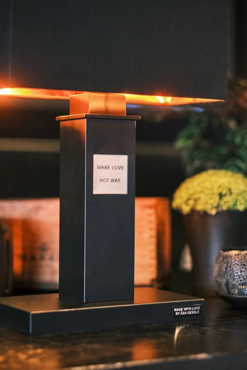 So auch die stylische Tischleuchte In Love, welche mit einer Metallplakate mit der Botschaft „Make love, not war“ verziert ist. Optisch punktet die schwarze Lampe mit einem schlichten Design, wobei der eckige Leuchtenschirm in Kombination mit dem schmalem Lampenfuß ein harmonisches Gesamtbild erzeugt. Die kupferne Innenbeschichtung des Lampenschirmes reflektiert das Licht in warmen Tönen, wodurch eine gemütliche Atmosphäre erzeugt wird.
