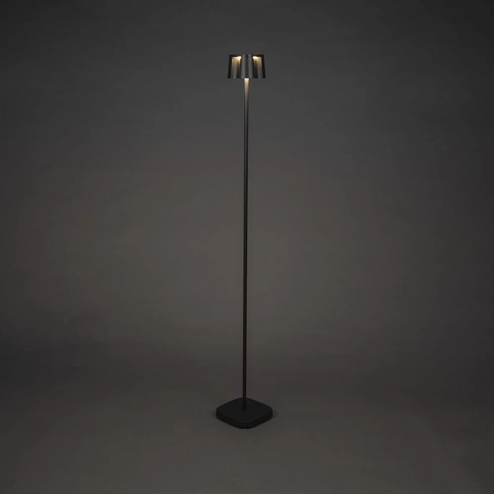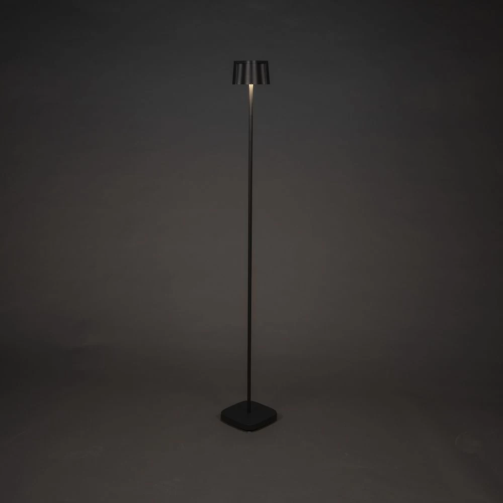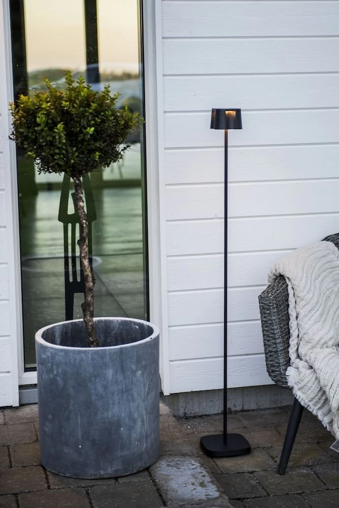 Die wunderschön geformte schwarz lackierte LED Standleuchte Nice erinnert in Ihrem Erscheinungsbild an die Falten eines Vorhanges, der sich sanft um das austretende Licht legt und macht ihrem Namen (Nice=Schön) damit alle Ehre. Ein außergewöhnliches Design made by Konstsmide! Das ausgefallene Äußere bildet einen schönen Blickfang auf Ihrer Terrasse oder bei der Gestaltung Ihres Aussenbereiches. Mit einer Schutzart von IP54 ist sie bestens als Outdoorleuchte geeignet. Aber auch im Innenbereich kann diese Leuchte verwendet werden. Aufgrund der Ausstattung der Stehlampe mit einem Akku erhalten Sie die Möglichkeit Nice immer wieder neu zu platzieren – auch im Wohnbereich. Wenn die Nächte nicht mehr zum verweilen auf der Terrasse einladen, holen Sie Ihre Lieblingsleuchte einfach herein und machen es sich im Innenbereich bequem.