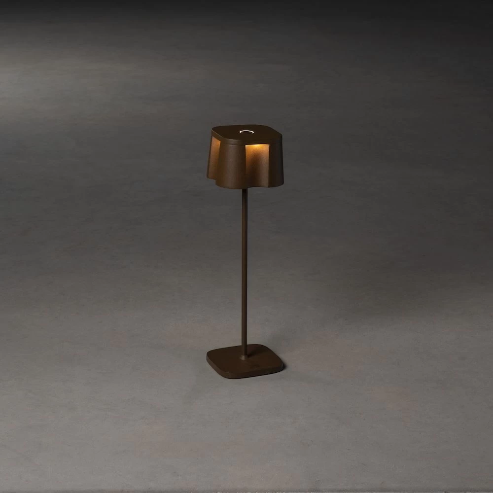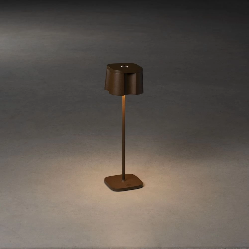 Die wunderschön geformte rostbraune LED Tischleuchte Nice erinnert in Ihrem Erscheinungsbild an die Falten eines Vorhanges, der sich sanft um das austretende Licht legt und macht ihrem Namen (Nice=Schön) damit alle Ehre. Ein außergewöhnliches Design made by Konstsmide! Das ausgefallene Äußere bildet einen schönen Blickfang auf einem Tisch auf Ihrer Terrasse oder bei der Gestaltung Ihres Aussenbereiches. Mit einer Schutzart von IP54 ist sie bestens als Outdoorleuchte geeignet. Aber auch im Innenbereich kann diese Leuchte verwendet werden. Aufgrund der Ausstattung der Tischlampe mit einem Akku erhalten Sie die Möglichkeit Nice immer wieder neu zu platzieren – auch im Wohnbereich. Wenn die Nächte nicht mehr zum verweilen auf der Terrasse einladen, holen Sie Ihre Lieblingsleuchte einfach herein und machen es sich im Innenbereich bequem.