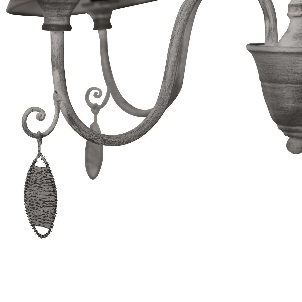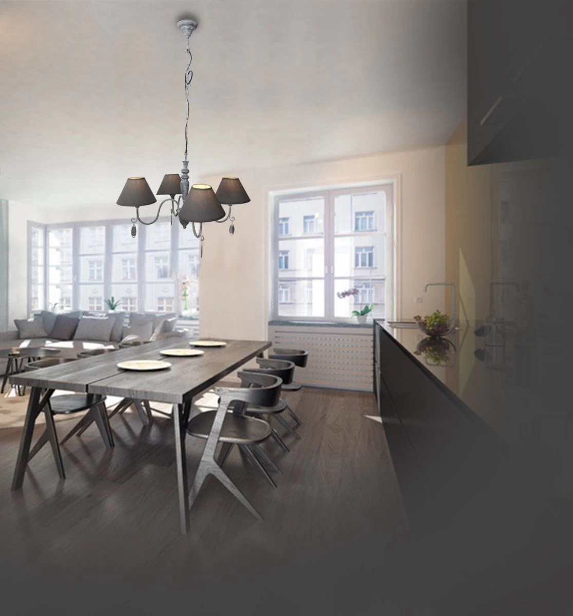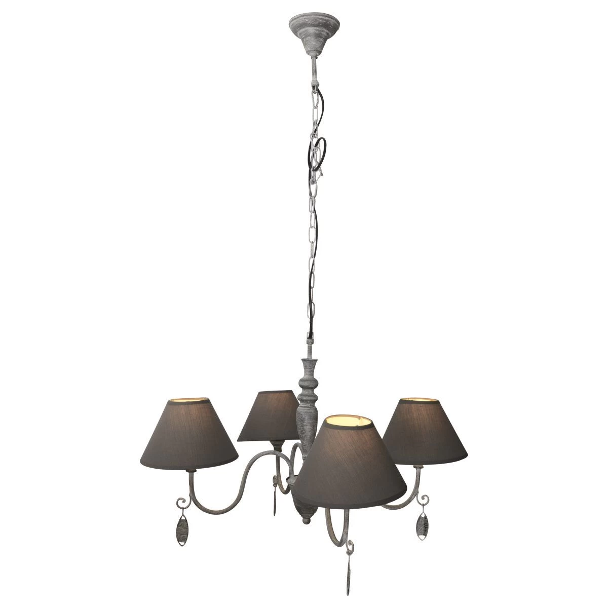 Ausgestattet mit vier E14-Fassungen, können sie die Deckenlampe mit Leuchtmitteln Ihrer Wahl mit maximal 40W verwenden. Die vier Lichtquellen des Kronleuchters wurden mit grauen, konisch zulaufenden Schirmchen versehen, die das Licht abschirmen und für eine blendfreie Beleuchtung sorgen.