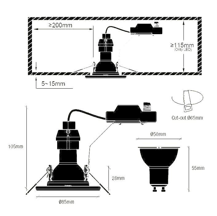 Dieser klassisch runde Einbauspot im 5-er Pack verfügt über einen nickel gebürsteten Metallrahmen und passt zu vielen unterschiedlichen Innenräumen. Perfekt setzt er unter ihm befindlichen Raum ins korrekte Licht. Mit einem Durchmesser von 8,5cm benötigt der Spot ein rundes Einbauloch von 6,5cm.