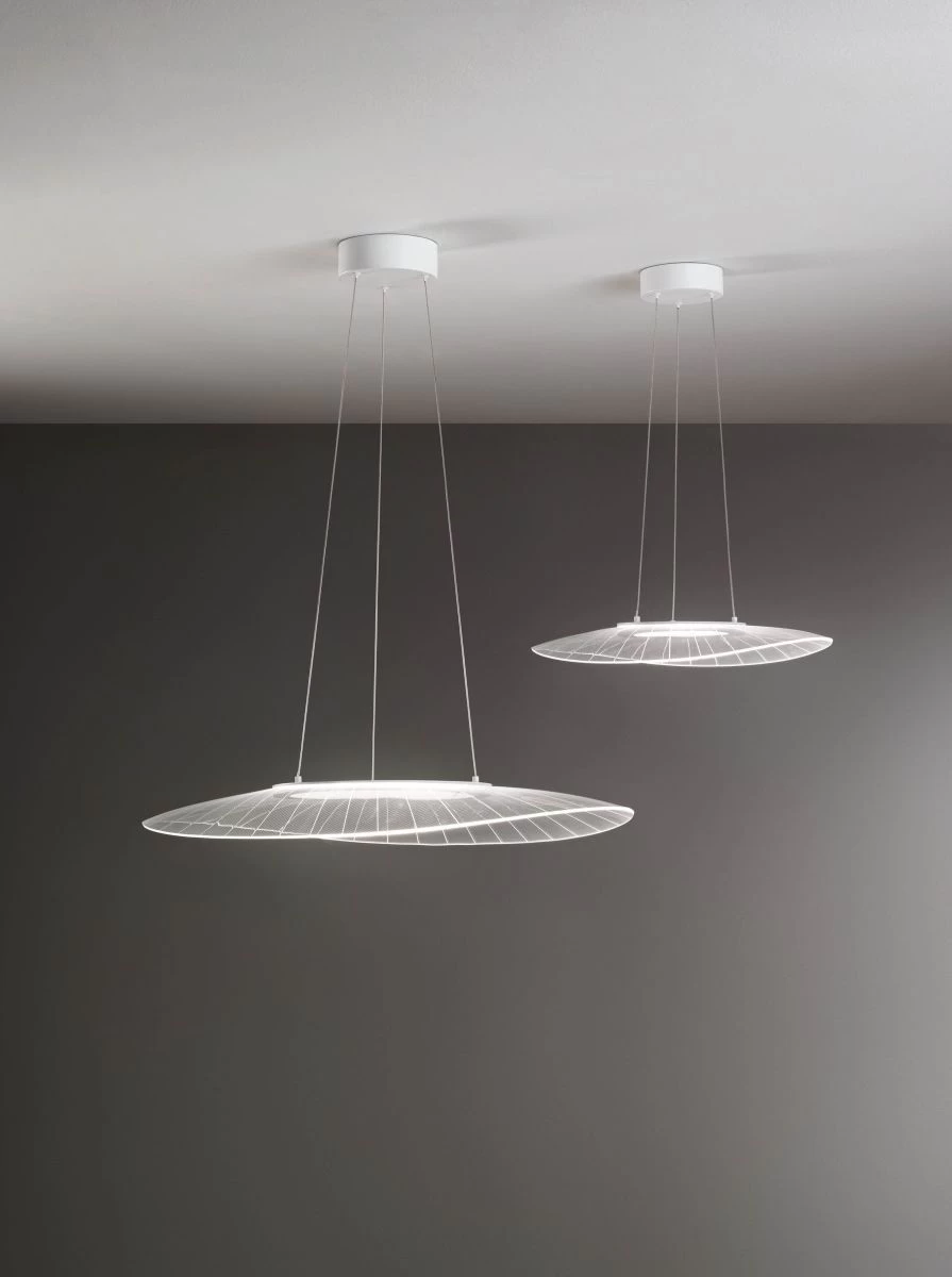 Die raffiniert gestaltete Pendelleuchte Vela von Fabas Luce zeichnet sich durch einen sanft geschwungenen ovalen Acrylschirm aus, welcher in der Mitte ein blendfreies LED verbirgt. Der in seiner größten Ausdehnung 780mm betragende weiß transparente Leuchtenschirm ist höhenverstellbar von 500 bis max. 2000mm. Dies ermöglicht eine optimale Ausleuchtung mit diffusem Licht und sorgt somit für eine gemütliche Wohnatmosphäre.