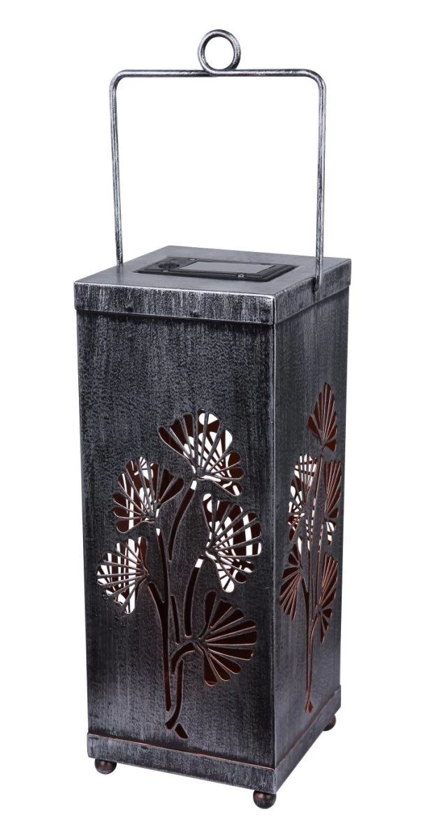 Solarleuchte Metall silberfarben antik, Laterne mit Dekorstanzungen, zum Hängen u. Stellen, IP44, inkl. 1xAA Ni-Mh 300mAh, LxBxH:110x110x268, inkl. 1xLED 0,06W 3V, 3000K
