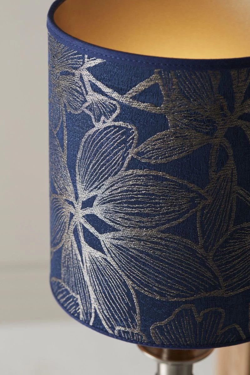Der Leuchtenschirm Celyn Ziba aus dem Hause PR Home punkte mit einem luxuriösen Design in der Farbe Blau mit einer goldenen Blütenstickerei. Die Innenseite des Schirms ist in Gold gefertigt worden, welches einen warmen Schimmer erzeugt.