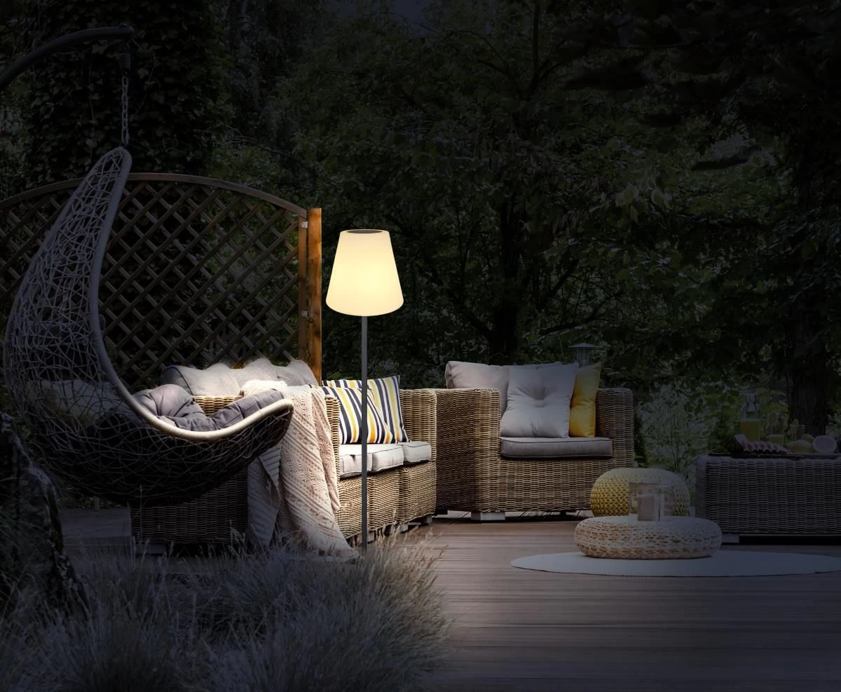 Die dekorative Solarstehleuchte mit Kunststoffschirm macht sicher auch in Ihrem Außenbereich eine gute Figur. Gestalten Sie daher Ihre Terasse ganz spontan und genießen Sie Ihren Aufenthalt in der Dämmerung bei stimmungsvollem Licht.
