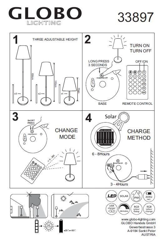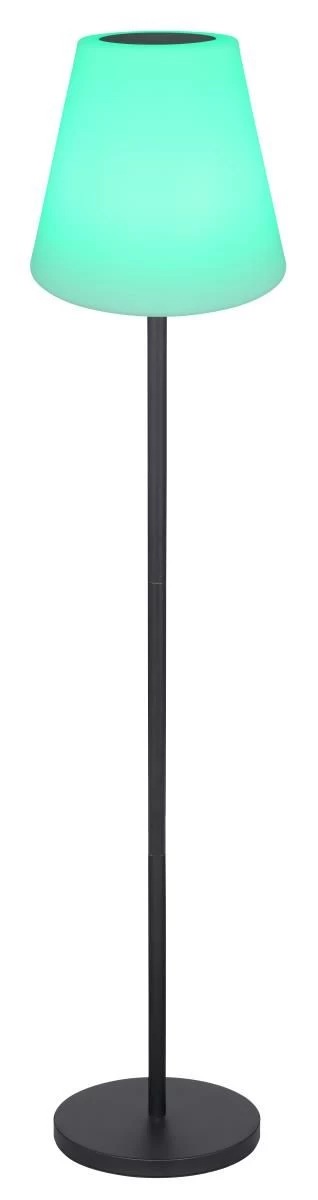 Bei aufgeladenem Akku und schwindendem Sonnenlicht beginnen die in dem opalfarbenem Schirm inkludierte neun RGBW LEDs zu leuchten. Mittels inkludierter Fernbedienung kann in weiß oder in RGB Farben gewechselt, gedimmt und fixiert werden.