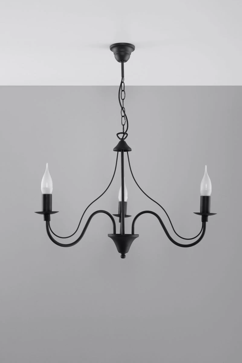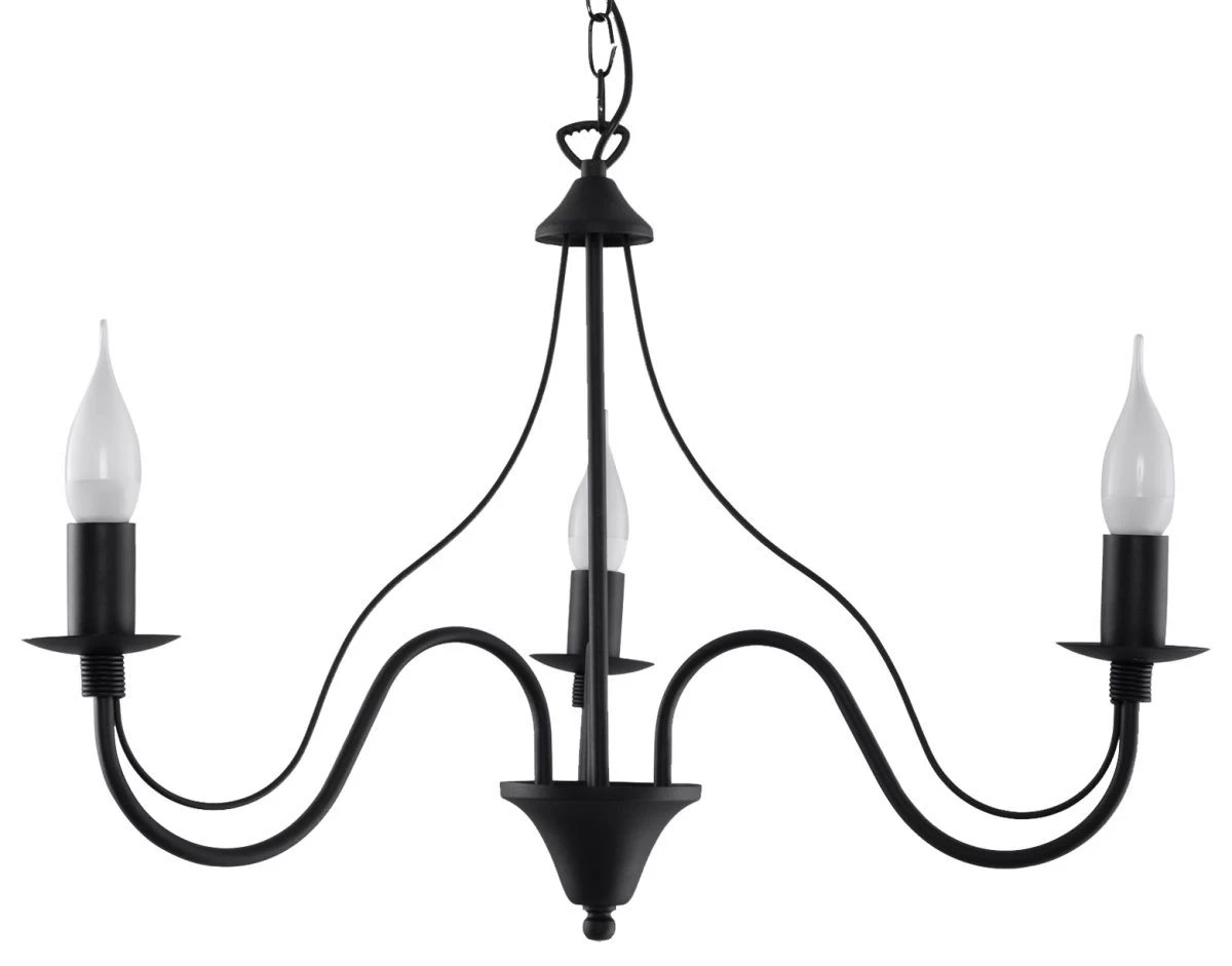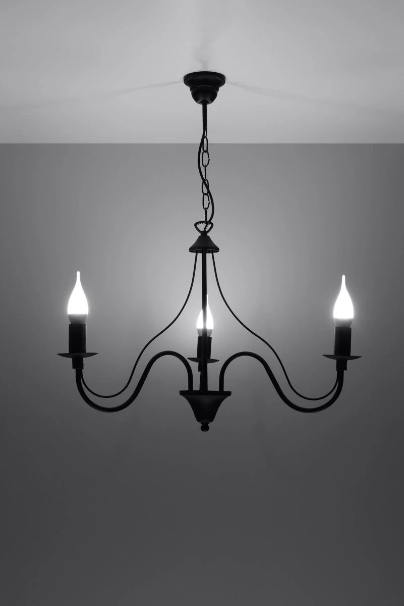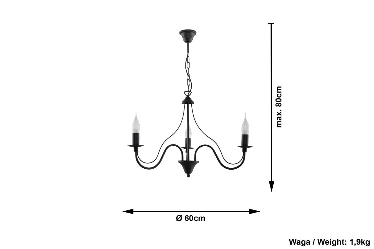 Der Kronleuchter MINERWA in schwarz mit seinen 3 Flammen fügt sich in jeden Raum ein ob Esszimmer,Wohnzimmer,Küche oder Flur. Vorstellbar ist der Einsatzort überall wo romantisches ,edles Design gefragt ist. Gefertigt aus Metall ist eine hochwertige Qualität gegeben die lange Haltbarkeit verspricht. Das Design ist angelehnt an frühere Epochen mit eigener Note aber zeitlos. Durch die individuelle Wahl moderner Leuchtmittel mit E14 Fassung können viele Wünsche der Lichtfarben abgedeckt werden. Die Aufhängung erfolgt über eine Kette mit Metallbaldachin in Lampenfarbe. Die Gesamtlänge der Lampe beträgt ca. 80 cm bei einem Durchmesser von ca. 60cm , wodurch es keine Probleme mit kleineren Räumen gibt. Für noch intensivere Ausleuchtung können auch MINERWA Lampen mit bis zu 7 Flammen gekauft werden.